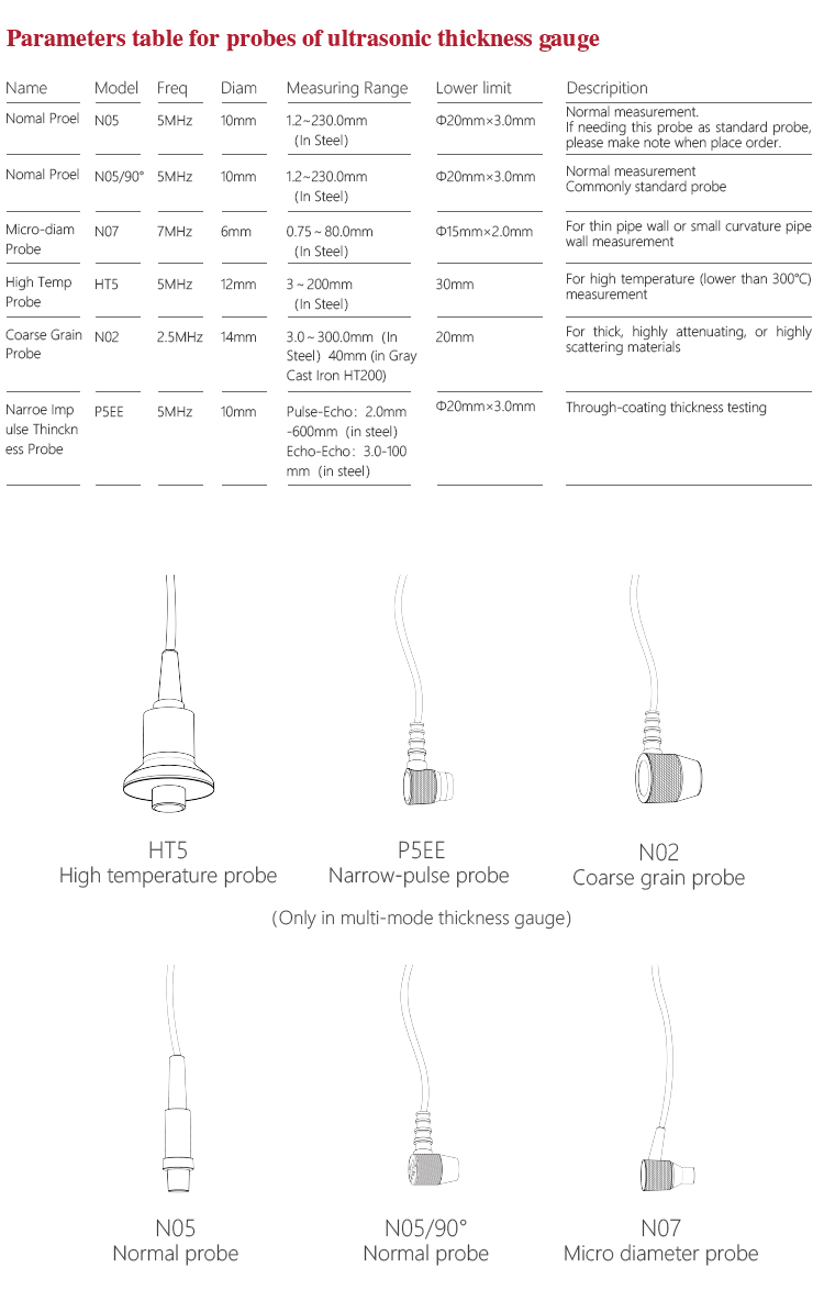 | Probe Diameter | Standard Probe P5EE is 10mm, Probe N05 is10MM、Probe N07 is 6MM、Probe HT5 is12MM、Probe N02 is12MM |