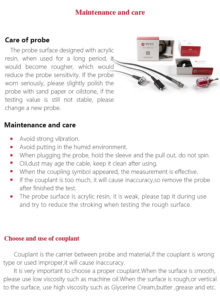 The couplant coated on the probe and the measured workpiece surface as the medium to isolate the air between them, selecting the proper viscosity couplant is the critical thing for the precisely measurement. Mitech series ultrasonic thickness gauge standard 75mm ultrasonic special couplant in the configuration for isolating the air between the ultrasonic probe and the workpiece surface, which can make probe produced ultrasonic wave into the workpiece effectively to ensure the accurate measurement of thickness. The couplant with squeeze bottle packing, it is clean and environmental. It is recommended to select the low viscosity couplant for measuring the smooth material and select the high viscosity couplant (like glycerine cream, butter and so on) for measuring the rough material.