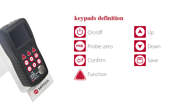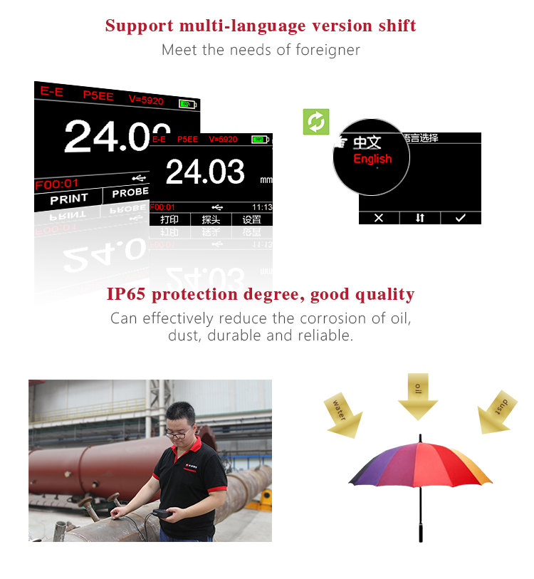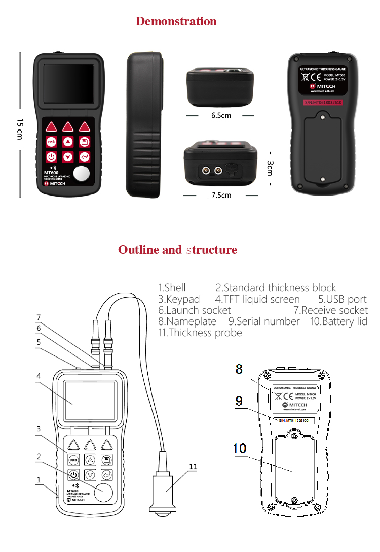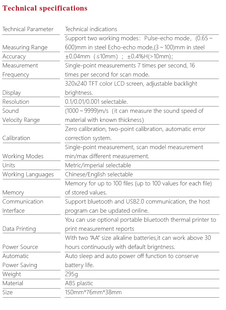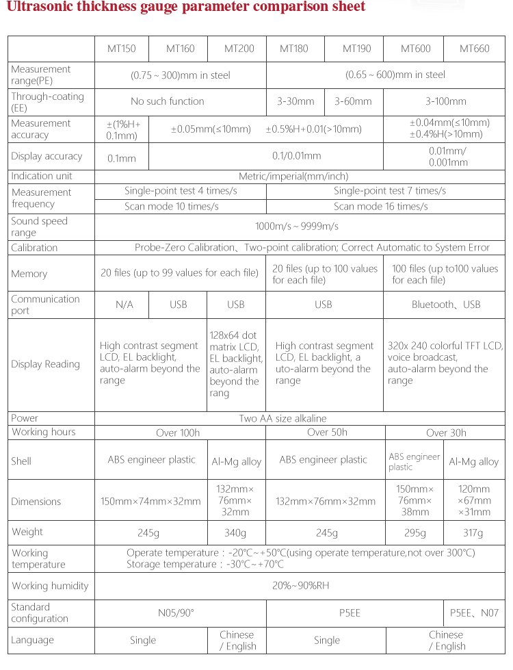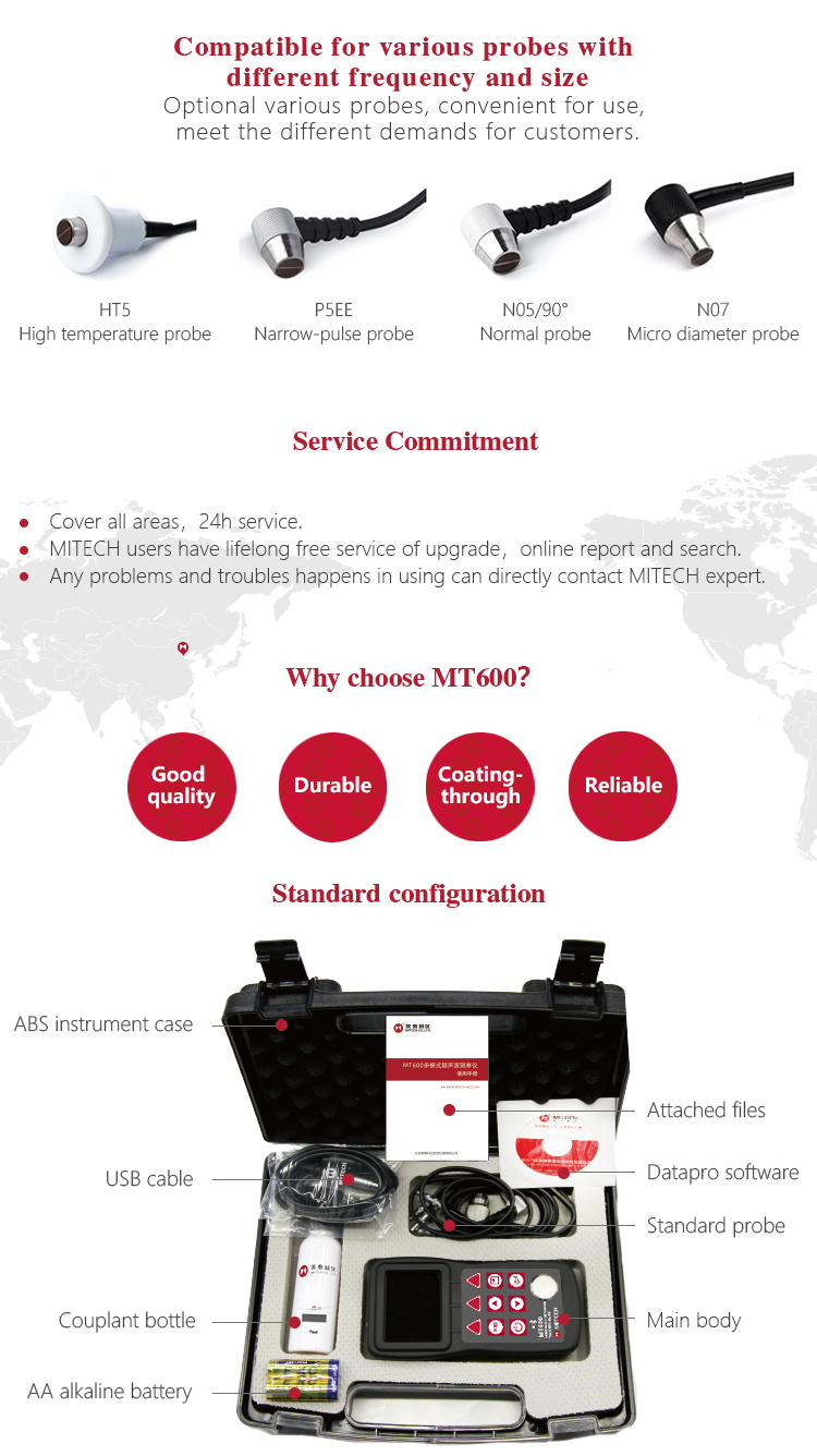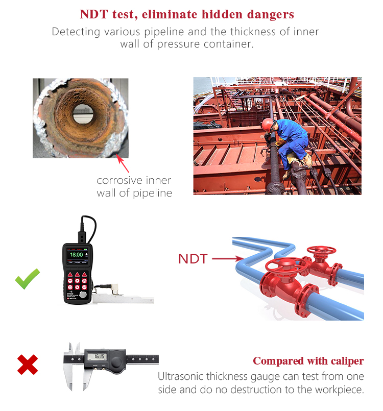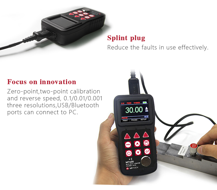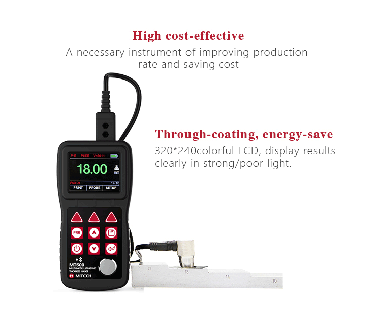 Product OverviewMT600 multi-mode ultrasonic thickness gauge is a upgraded product. We pay more attention to user experience and innovative features such as visual experience, protection grade, automatic alarm and etc..Color TFT display (320×240 TFT LCD) with adjustable backlight, allow the user to work at worksites with low visibility. IP65 degree of protection, can effectively prevent harsh field environments of oil, dust and other corrosion. It also has voice broadcast function, automatic alarm., 0.1mm/0.01mm/0.001mm resolution, bluetooth communication and penetrate the coating mode and normal mode functions and etc.. It can measure the substrate thickness without the need to dispose of coating directly. Its unique non-destructive testing performance provide the perfect solution for the thickness testing of closed Pipes, containers, etc. It is widely used in petroleum, chemical, metallurgy, shipbuilding, aviation, aerospace and other fields because of monitoring corrosion thinning degree of various pipes and pressure vessels.It can also be used for precise measurement of sheet metal and machined parts. This professional precision instrument is to improve production efficiency and qualified rate, cost saving.