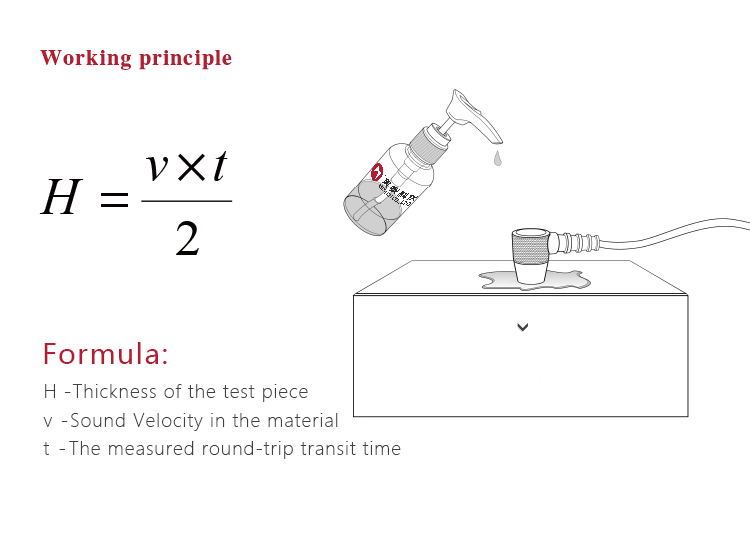 The digital ultrasonic thickness gauge determines the thickness of a part or structure by accurately measuring the time required for a short ultrasonic pulse generated by a transducer to travel through the thickness of the material, reflect from the back or inside surface, and be returned to the transducer. The measured two-way transit time is divided by two to account for the down-and-back travel path, and then multiplied by the velocity of sound in the material. The result is expressed in the well-known relationship: H=v×t/2