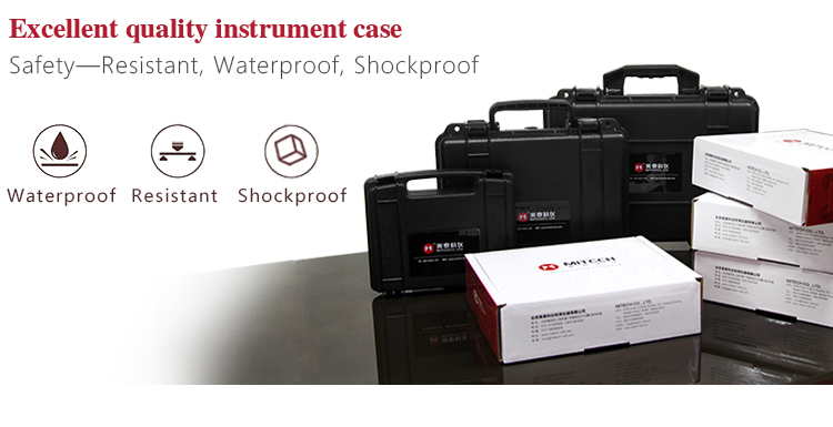 The instrument case of Mitech ultrasonic thickness gauge, length: 27cm, width: 22.5cm, height: 7.5cm and weight: 0.698kg, designed with ABS engineering plastic, It has excellent performance like waterproof, shockproof, excellent heat resistance and low temperature resistance. It can effectively prevent oil, dust and corrosion in harsh environment. Its size in line with the standards for aviation and train carrying (capable of putting under the seat and on the luggage rack), it is safe, reliable and stable.