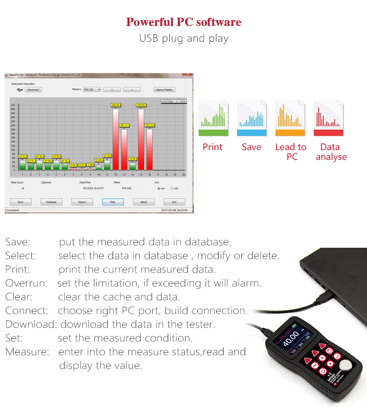 The data proceeding software for ultrasonic thickness gauge, the standard configuration for MT600/MT660, it can be easily and quickly do data exchange and parameter settings with PC. It has rich features like measurement storage management, statistical analysis of measured value, printing measurement report and so on. It is suitable for steel manufacturing, ship-building, automobile manufacturing, aircraft manufacturing, high pressure vessels, electric devices, bearings, standard parts, metal textile accessories and instrumentation accessories and production enterprises related with metal material products. With the analysis results provided by the software, it can make enterprise quality control more scientific basis and higher traceability. Improving the quality of enterprise information management level is the effectively guarantee for enterprise analysis the product qualification rate and improve the quality monitor. The software can also be used as effective tools in scientific research units related with metal materials, manufacturing plants, universities and other departments engaged in theoretical teaching, experimental analysis and basic scientific research.