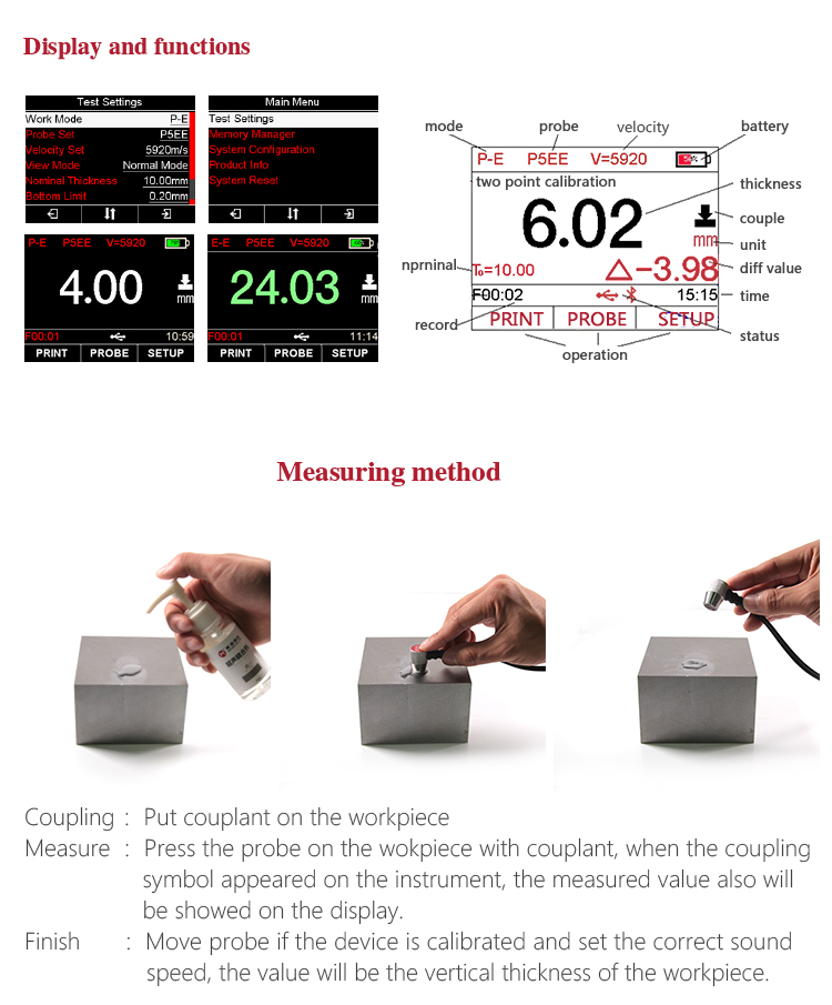 Instrument FeaturesMulti-mode: Pulse-Echo mode (P-E mode) and Echo-Echo mode (E-E mode). In Echo-Echo mode, it can test the wall thickness eliminating paint or coating thickness.