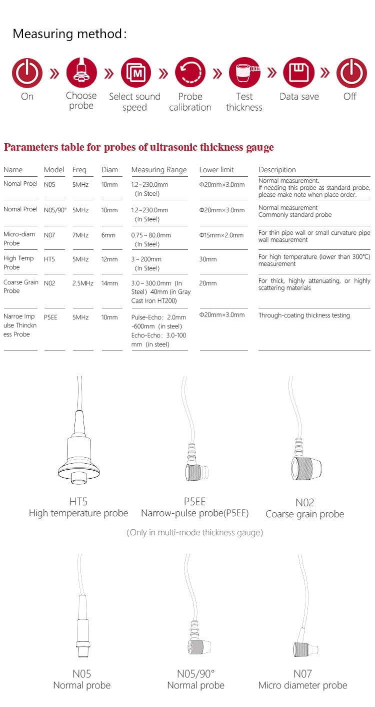 | Probe Diameter | Standard Probe P5EE is 10mm, Probe N05 is10MM、Probe N07 is 6MM、Probe HT5 is12MM、Probe N02 is12MM |