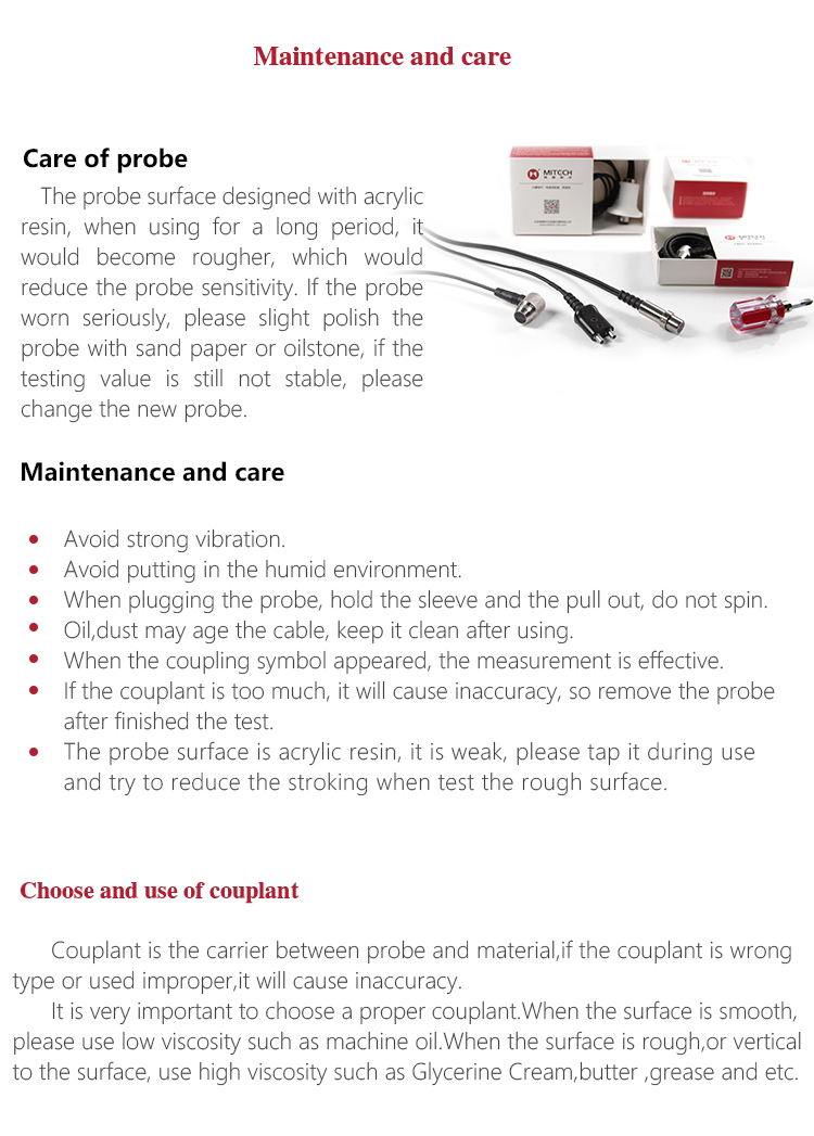 The couplant coated on the probe and the measured workpiece surface as the medium to isolate the air between them, selecting the proper viscosity couplant is the critical thing for the precisely measurement. Mitech series ultrasonic thickness gauge standard 75mm ultrasonic special couplant in the configuration for isolating the air between the ultrasonic probe and the workpiece surface, which can make probe produced ultrasonic wave into the workpiece effectively to ensure the accurate measurement of thickness. The couplant with squeeze bottle packing, it is clean and environmental. It is recommended to select the low viscosity couplant for measuring the smooth material and select the high viscosity couplant (like glycerine cream, butter and so on) for measuring the rough material.