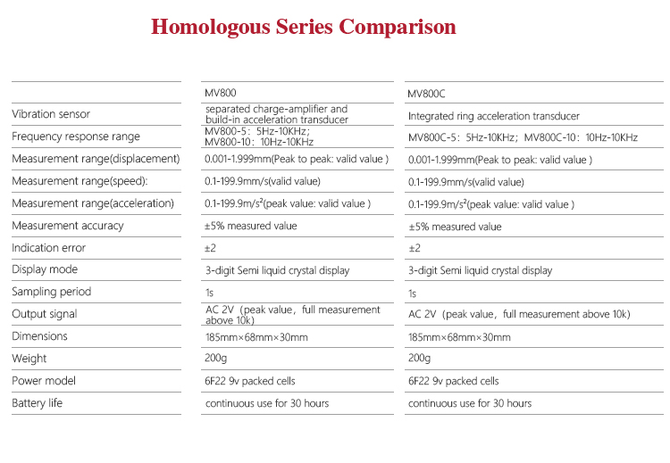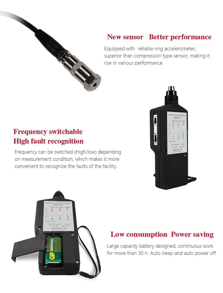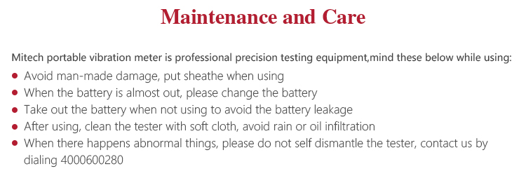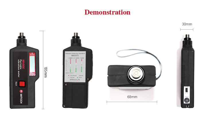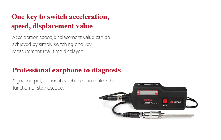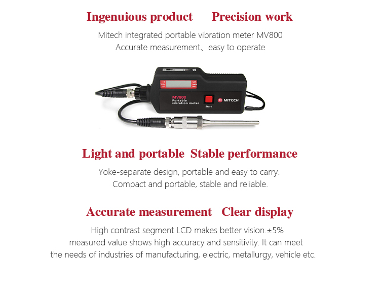 Product OverviewMITECH portable vibration meter MV800 is made up of piezoelectric transducer and digital display circuit. It is mainly used to measure vibration acceleration, speed and displacement of various rotary machine. This product has the advantages of large measurement, wide variety, intuitively demonstration, small size, light weight etc. It is widely used in measurement on site or at height and can reduce the working strength, improve the working efficiency.