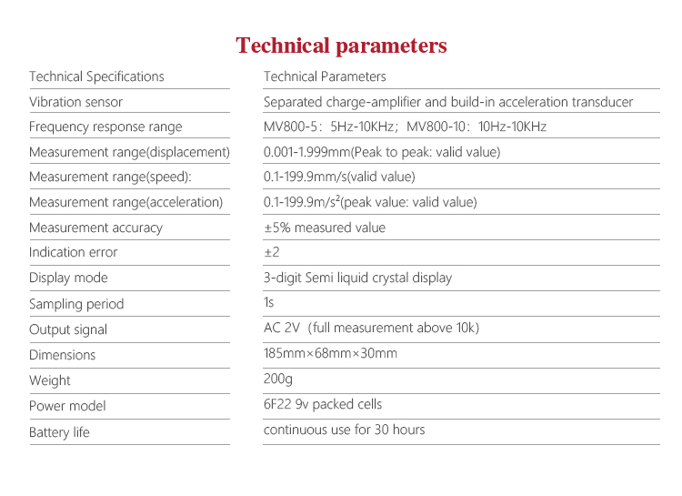Working PrincipleMV800 combines the quartz crystal and PZT piezoelectric effect together. When the quartz crystal or PZT is under strength, the surface generates charger, the vibration was changed into electrical signal by acceleration transducer. After processing and analyzing, the acceleration, speed and displacement are shown out in the liquid screen.