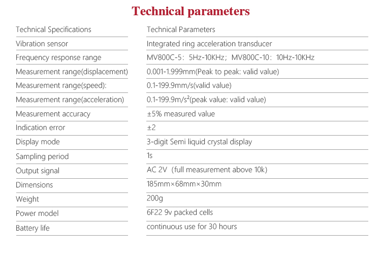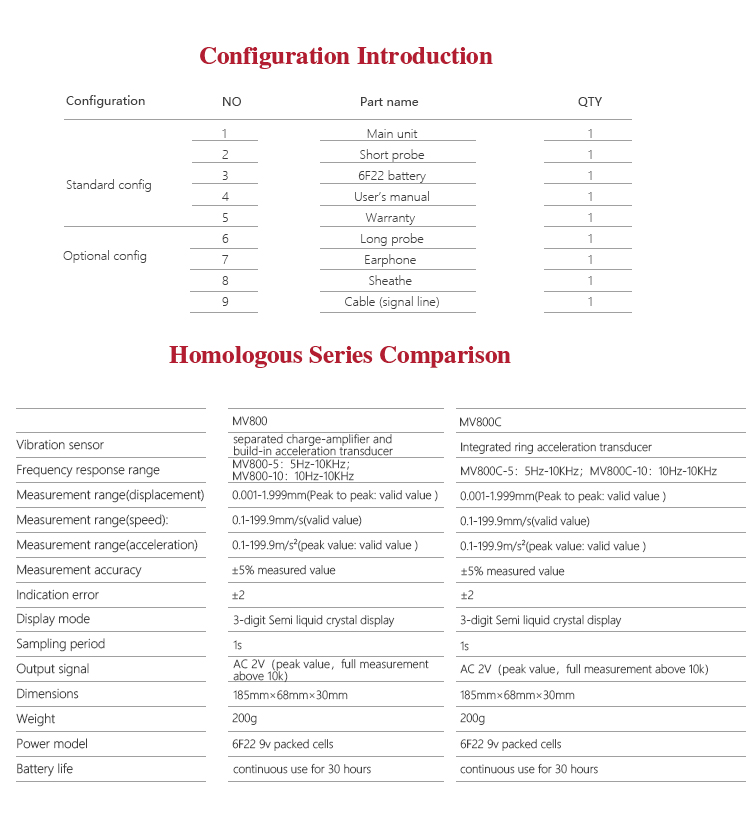 Product OverviewMITECH portable vibration meter MV800C is made up of piezoelectric transducer and digital display circuit. It is mainly used to measure vibration acceleration, speed and displacement of various rotary machine. This product has the advantages of large measurement, wide variety, intuitively demonstration, small size, light weight etc. It is widely used in measurement on site or at height and can reduce the working strength, improve the working efficiency.