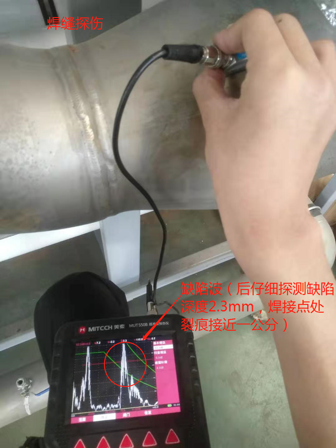 現場了解到,待測工件為4-8mm的管道焊縫,焊接工藝采用的是不銹鋼焊絲焊的氣體保護焊,主要是對接焊和角焊,現場目視焊縫焊接基本美觀平整。根據實際情況,美泰工程師選用2.5p 9*9 k3的單晶斜探頭進行檢測,對接焊處焊接點可以觀察到明顯的缺陷波。對接焊接管道處進行全面掃查探傷后,焊接點缺陷明顯,角焊處角落有小氣泡的存在。
