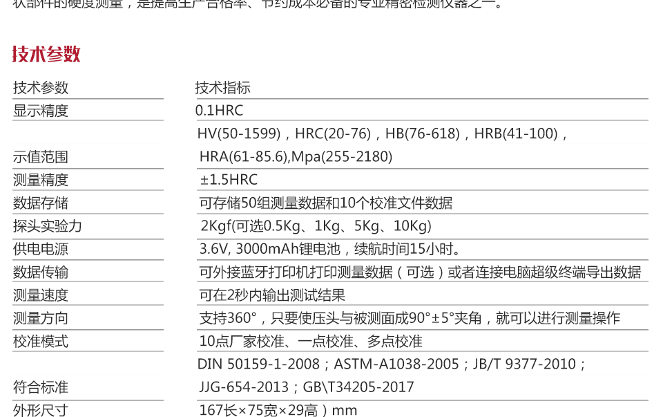 主要用于測量金屬洛氏(HRC)硬度,自帶硬度制式轉換功能,可在布氏(HB)、洛氏(HRC)、維氏(HV)三種硬度制式間相互轉換;