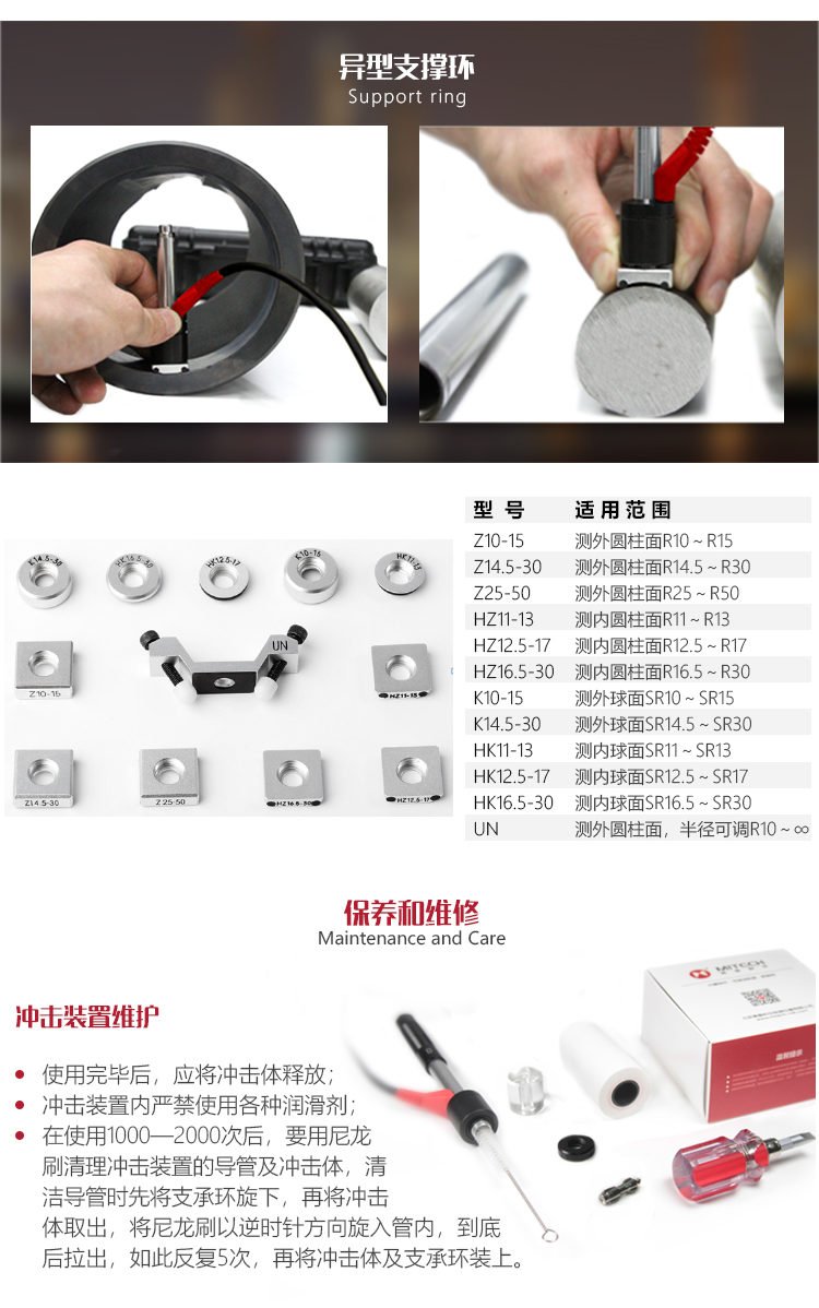 曲面工件:工件的試驗面最好是平面。當被測表面曲率半徑R小于30mm的工件在測試時應使用小支承環或異型支承環;