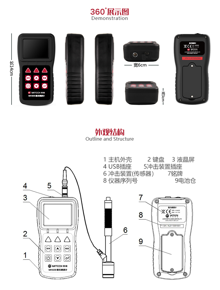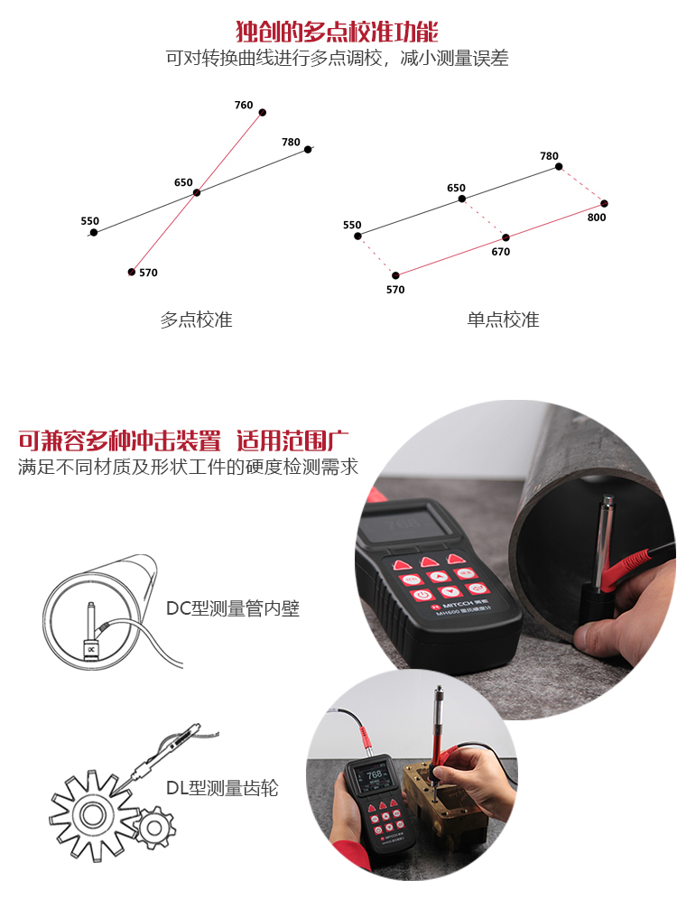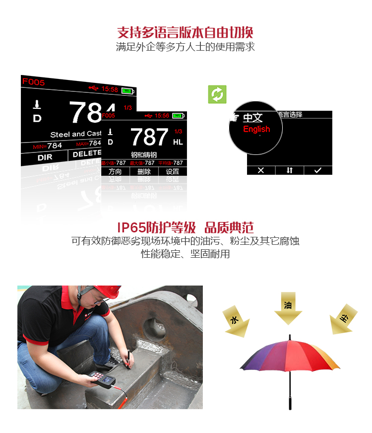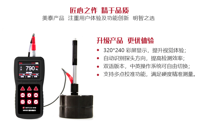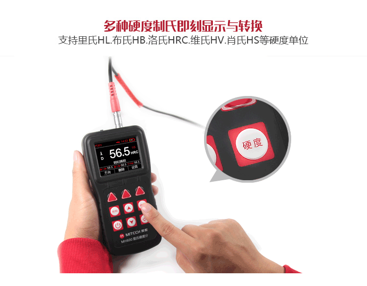 MH600便攜式里氏硬度計,智能化設計可方便快捷地現場檢測金屬硬度。IP65防護等級,可有效防御惡劣現場環境中的油污、粉塵及其它腐蝕;采用彩色液晶顯示屏,光線昏暗及日光強烈環境下也能為您呈現清晰測量結果,大大提升了視覺體驗;獨創的多點校準功能,可對轉換曲線進行多點調校,減小測量誤差;測量中儀器可自動識別測量方向,超出設定范圍自動報警、可語音播報測量結果,滿足高效采集多角度材料的精準檢測需求,支持多種硬度制氏間的自由轉換;低功耗設計由兩節AA五號電池供電,支持多種語言版本切換。被廣泛地應用于金屬加工制造業、特種設備或永久性組件的在役失效分析、商檢等領域。特別適宜對大型不可拆卸部件的現場硬度測試。是提高生產合格率、節約成本必備的專業精密儀器。
