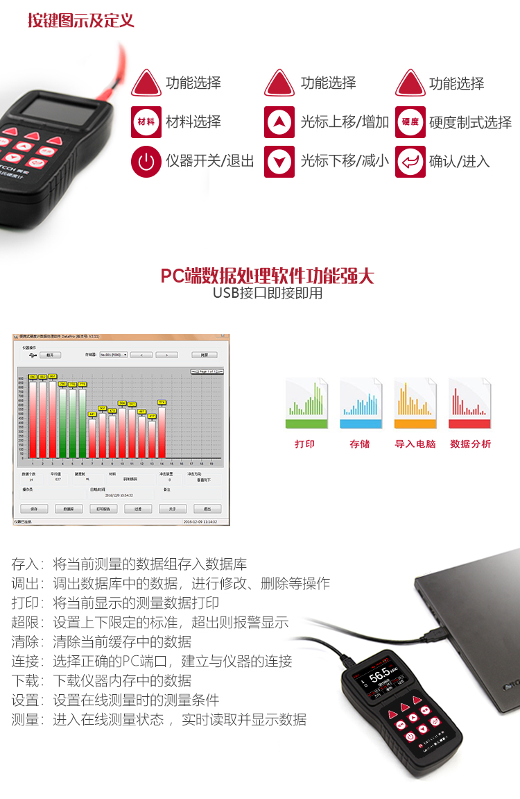 設有USB接口,通過PC端數據處理軟件,可傳輸測量結果、測值存儲管理、測值統計分析、打印測值報告、批量設定儀器參數等,滿足質量保證和管理的更高需求