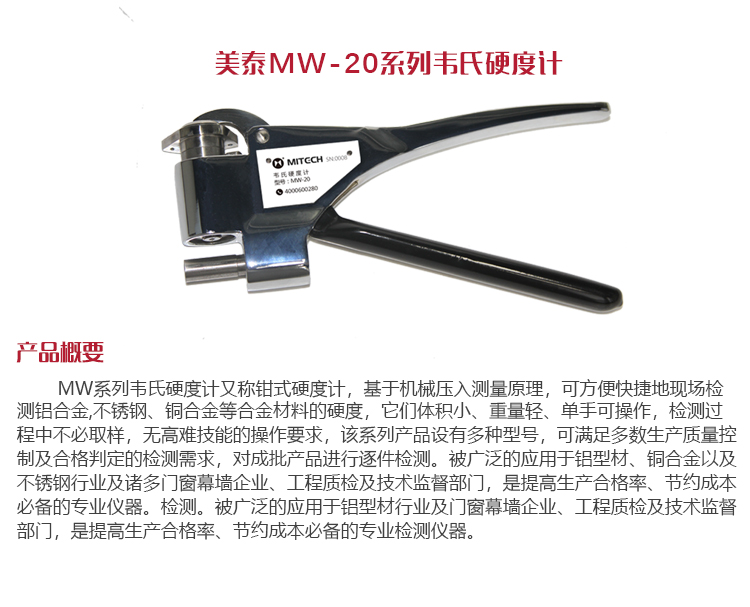 產品概述MW-20系列鋁合金系列韋氏硬度計又稱鉗式硬度計,基于機械壓入測量原理,可方便快捷地現場檢測鋁合金材料的硬度。它們體積小、重量輕、單手可操作,檢測過程中不必取樣,無高難技能的操作要求。該系列產品設有多種型號,可滿足多數生產質量控制及合格判定的檢測需求,對成批產品進行逐件檢測。被廣泛的應用于鋁型材行業及諸多門窗幕墻企業、工程質檢及技術監督部門,是提高生產合格率、節約成本必備的專業儀器。