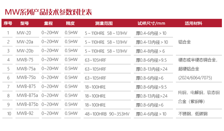 操作方法及注意事項MW-20系列鋁合金韋氏硬度計設有MW-20、MW-20a、MW-20b三種型號。MW-20型為通用型,用于測量厚度在0.8-6.0mm材料;MW-20a型為厚材專用型,用于測量厚度在6.0-13mm的材料;MW-20b型為細管材專用型,用于測量內徑為6.0mm以上的管材。三種型號的儀器均可用于測量管材、板材和型材。