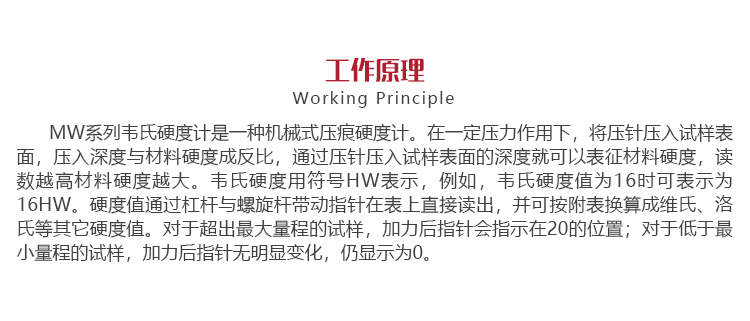 工作原理MW-20系列鋁合金系列韋氏硬度計是一種機械式壓痕硬度計。在一定壓力作用下,將壓針壓入試樣表面,壓針壓入試樣表面的深度與材料硬度成反比,通過杠桿與螺旋桿帶動指針將壓入深度轉換為材料硬度值并在表盤上顯示出測量結果。韋氏硬度用符號HW表示,例如,韋氏硬度值為16時可表示為16HW。測得的韋氏硬度值可依據附表換算成維氏、洛氏等其它硬度值。對于超出最大量程的試樣,加力后指針會指示在表盤滿刻度值20的位置;對于低于最小量程的試樣,加力后指針無明顯變化,仍顯示為0。