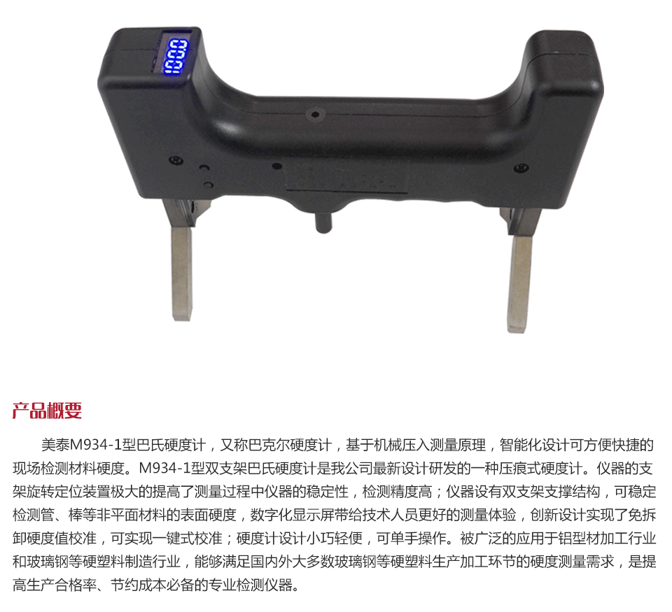 美泰M934-1型巴氏硬度計,又稱巴克爾硬度計,基于機械壓入測量原理,智能化設計可方便快捷的現場檢測材料硬度。M934-1型雙支架巴氏硬度計是我公司最新設計研發的一種壓痕式硬度計。儀器的支架旋轉定位裝置極大的提高了測量過程中儀器的穩定性,檢測精度高;儀器設有雙支架支撐結構,可穩定檢測管、棒等非平面材料的表面硬度,數字化顯示屏帶給技術人員更好的測量體驗,創新設計實現了免拆卸硬度值校準,可實現一鍵式校準;硬度計設計小巧輕便,可單手操作。被廣泛的應用于鋁型材加工行業和玻璃鋼等硬塑料制造行業,能夠滿足國內外大多數玻璃鋼等硬塑料生產加工環節的硬度測量需求,是提高生產合格率、節約成本必備的專業檢測儀器。