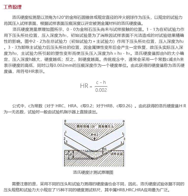 公式中,c為常數(shù)(對(duì)于 HRC、HRA,c取0.2;對(duì)于HRB,c取0.26)。由此獲得的洛氏硬度值HR為一無(wú)名數(shù),試驗(yàn)時(shí)一般由試驗(yàn)機(jī)指示器上直接讀出。