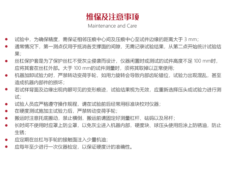 儀器的保養(yǎng)與維護(hù)?試驗(yàn)中,為確保精度,需保證相鄰壓痕中心間及壓痕中心至試件邊緣的距離大于 3 mm;