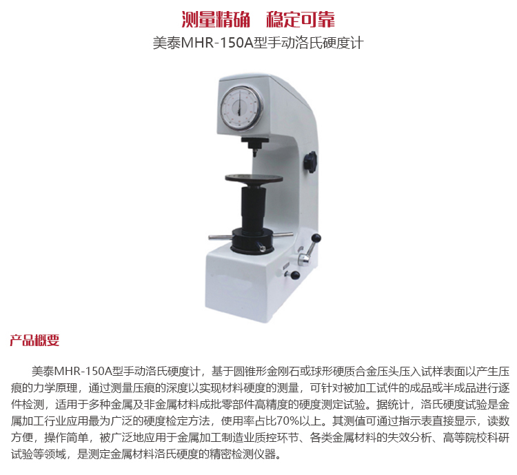 產(chǎn)品概述美泰MHR-150A型手動(dòng)洛氏硬度計(jì),基于圓錐形金剛石或球形硬質(zhì)合金壓頭壓入試樣表面以產(chǎn)生壓痕的力學(xué)原理,通過(guò)測(cè)量壓痕的深度以實(shí)現(xiàn)材料硬度的測(cè)量,可針對(duì)被加工試件的成品或半成品進(jìn)行逐件檢測(cè),適用于多種金屬及非金屬材料成批零部件高精度的硬度測(cè)定試驗(yàn)。據(jù)統(tǒng)計(jì),洛氏硬度試驗(yàn)是金屬加工行業(yè)應(yīng)用最為廣泛的硬度檢定方法,使用率占比70%以上。其測(cè)值可通過(guò)指示表直接顯示,讀數(shù)方便,操作簡(jiǎn)單,被廣泛地應(yīng)用于金屬加工制造業(yè)質(zhì)控環(huán)節(jié)、各類金屬材料的失效分析、高等院校科研試驗(yàn)等領(lǐng)域,是測(cè)定金屬材料洛氏硬度的精密檢測(cè)儀器。