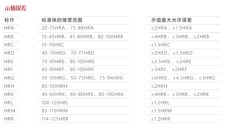 | 洛氏標(biāo)尺 | HRA、HRB、HRC、HRD、HRE、HRF、HRG、HRH、HRK、HRL、HRM、HRP、HRR、HRS、HRV |