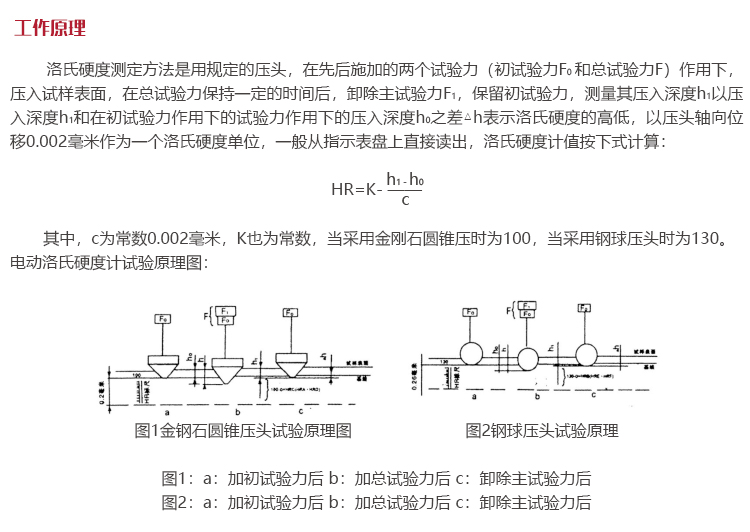 工作原理洛氏硬度測定方法是用規定的壓頭,在先后施加的兩個試驗力(初試驗力F0和總試驗力F)作用下,壓入試樣表面,在總試驗力保持一定的時間后,卸除主試驗力F1,保留初試驗力,測量其壓入深度h1以壓入深度h1和在初試驗力作用下的試驗力作用下的壓入深度h0之差△h表示洛氏硬度的高低,以壓頭軸向位移0.002毫米作為一個洛氏硬度單位,一般從指示表盤上直接讀出,洛氏硬度計值按下式計算: