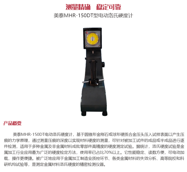美泰MHR-150DT電動洛氏硬度計,基于圓錐形金剛石或球形硬質合金壓頭壓入試樣表面以產生壓痕的力學原理,通過測量壓痕的深度以實現材料硬度的測量,可針對被加工試件的成品或半成品進行逐件檢測,適用于多種金屬及非金屬材料成批零部件高精度的硬度測定試驗。據統計,洛氏硬度試驗是金屬加工行業應用最為廣泛的硬度檢定方法,使用率已占比70%以上。它性能穩定、讀數方便,可電動加載,操作更便捷。被廣泛地應用于金屬加工制造業質控環節、各類金屬材料的失效分析、高等院校和科研機構試驗等,是測定金屬材料洛氏硬度的精密檢測儀器。