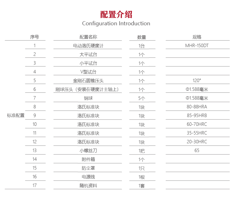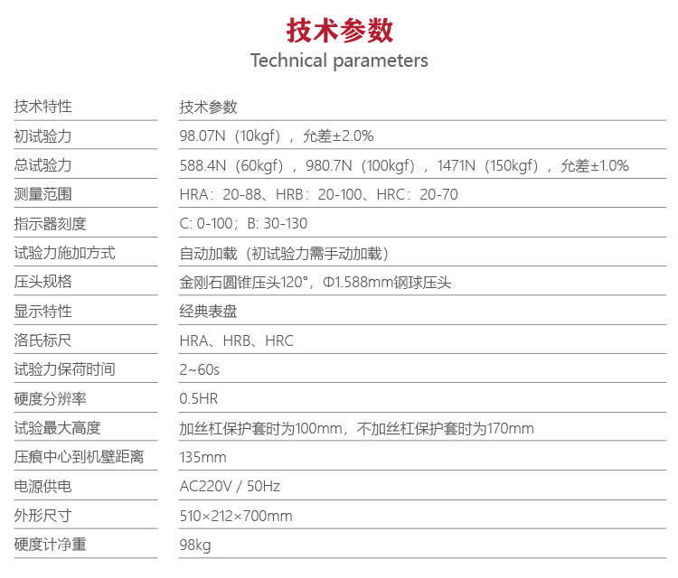 | 壓頭規格 | 金剛石圓錐壓頭120°,Φ1.588mm鋼球壓頭 |