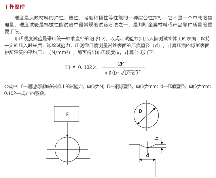 布氏硬度試驗是采用統一標準直徑的鋼球(D)壓頭,以規定試驗力(F)壓入被測試件表面,保持一定的壓入時長后,卸除試驗力,用測微目鏡測量試件表面的壓痕直徑(d),以計算壓痕的球形表面積所承受的平均壓力(N/mm2),即可得出布氏硬度值。計算公式如下: