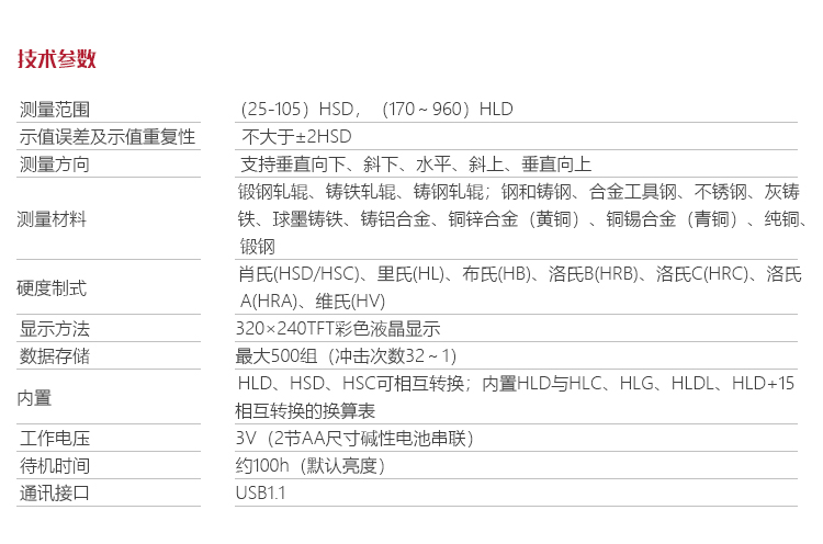 | 硬度制式: | 肖氏(HSD/HSC)、里氏(HL)、布氏(HB)、洛氏B(HRB)、洛氏C(HRC)、洛氏A(HRA)、維氏(HV) |