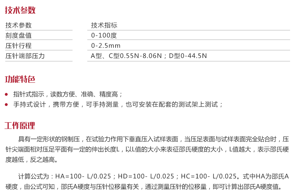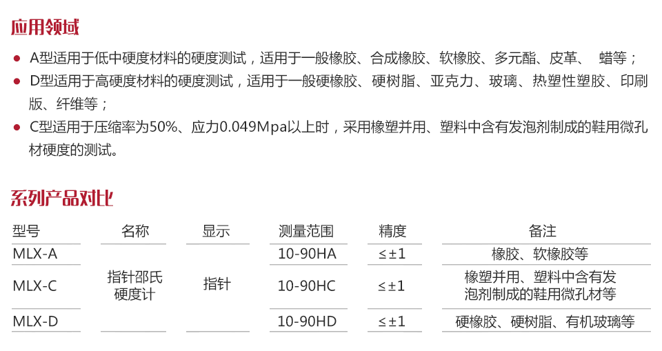 美泰MLX-A、C、D型指針邵氏硬度計(jì),構(gòu)造簡(jiǎn)單、小巧便攜、讀數(shù)直觀、使用方便,既可手持測(cè)量,亦可置于配套的定荷架上定荷測(cè)定,被廣泛應(yīng)用于橡膠、塑料的硬度測(cè)定。