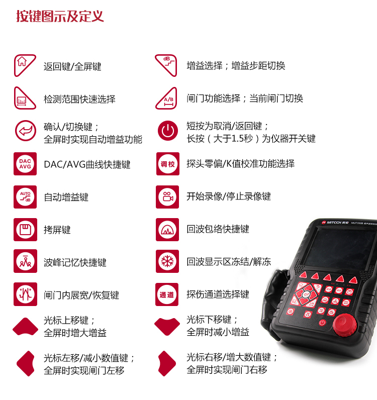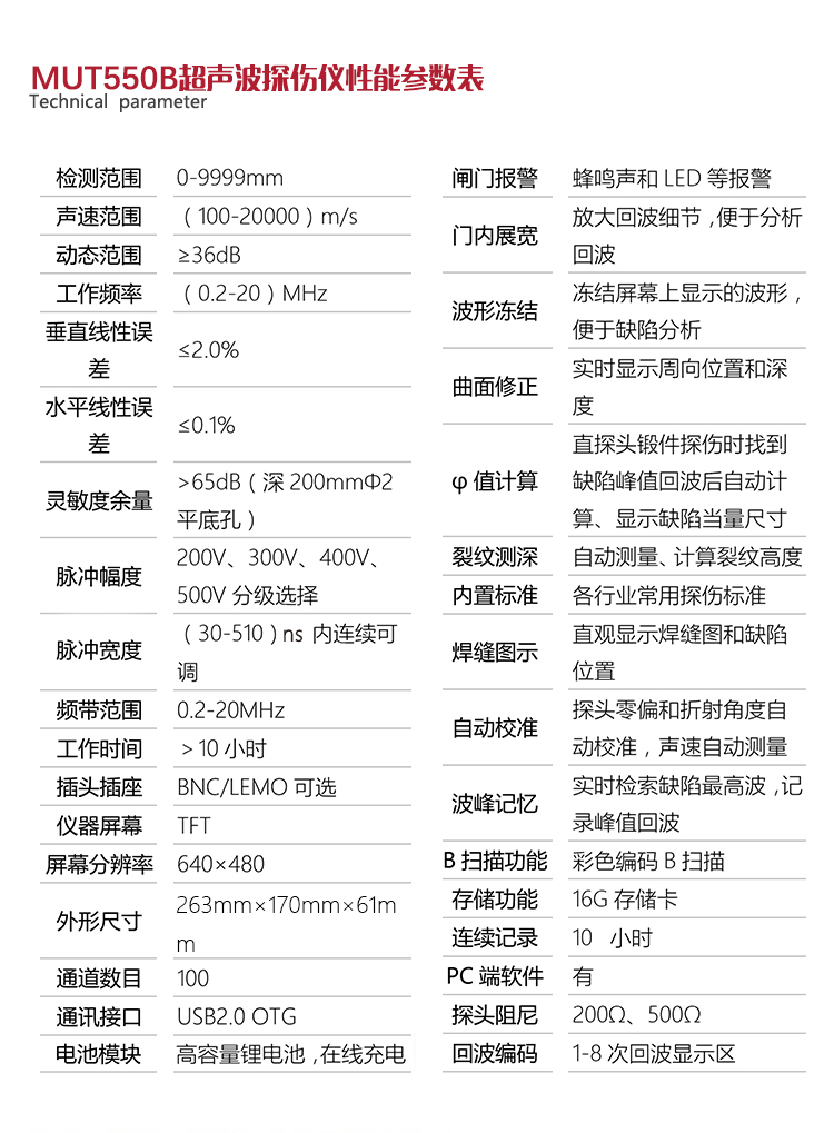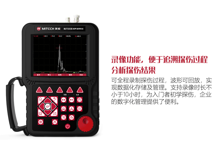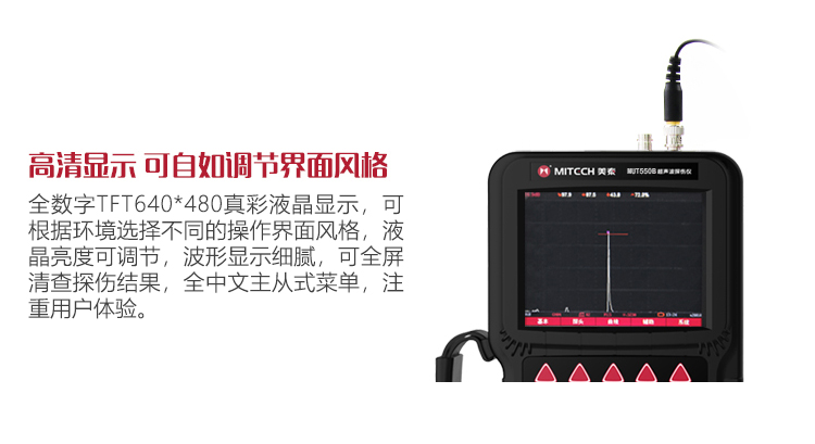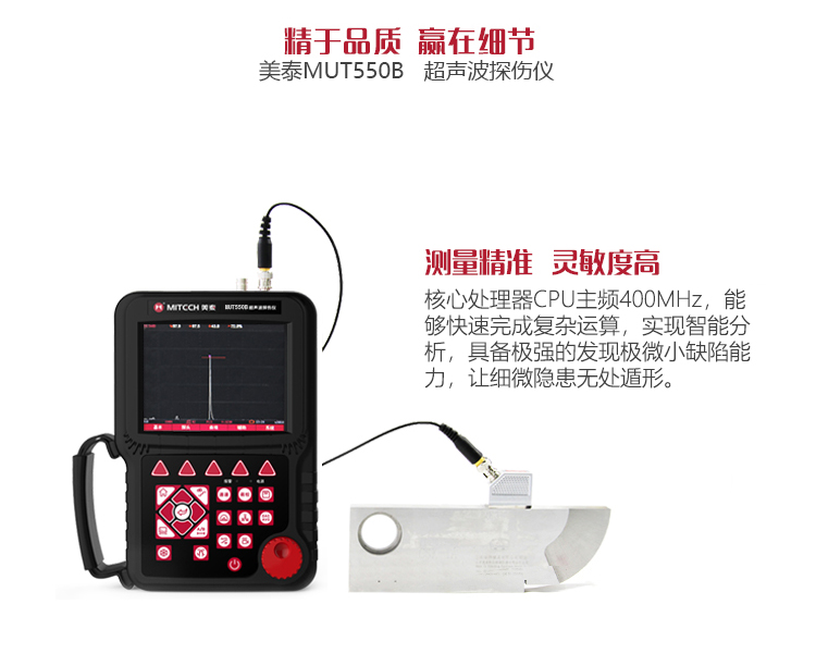 產(chǎn)品概述MUT550B數(shù)字式超聲波探傷儀依據(jù)超聲傳播原理,可精準(zhǔn)、靈敏地進(jìn)行工件內(nèi)部多種缺陷(裂紋、夾雜、氣孔等)的檢測(cè)、定位、評(píng)估和診斷。采用全數(shù)字TFT640×480真彩色液晶顯示屏,在光線昏暗及日光強(qiáng)烈環(huán)境下都能為您呈現(xiàn)清晰缺陷;0-9999mm大量程可滿足制造業(yè)、鋼鐵冶金業(yè)、金屬加工業(yè)、化工業(yè)等常規(guī)的缺陷檢測(cè)需求;低功耗設(shè)計(jì)配備大容量高性能鋰離子電池模塊可連續(xù)工作10小時(shí)以上;全中文主從式菜單,注重用戶體驗(yàn),集快捷按鍵、數(shù)碼飛梭旋輪、十字菜單三種操作方式于一體,不同使用習(xí)慣均可操作自如;設(shè)有綜合性能指標(biāo)自檢功能,可自動(dòng)生成測(cè)試報(bào)告,支持多語言。該產(chǎn)品具有很高的性價(jià)比,是實(shí)用經(jīng)濟(jì)款超聲檢測(cè)儀器的明智之選。