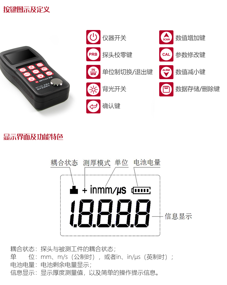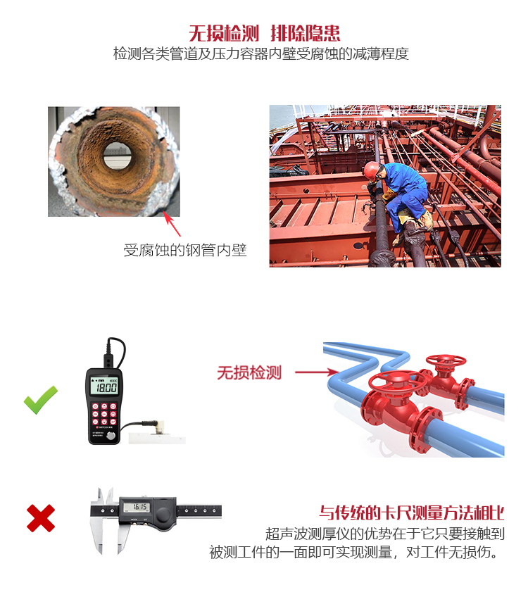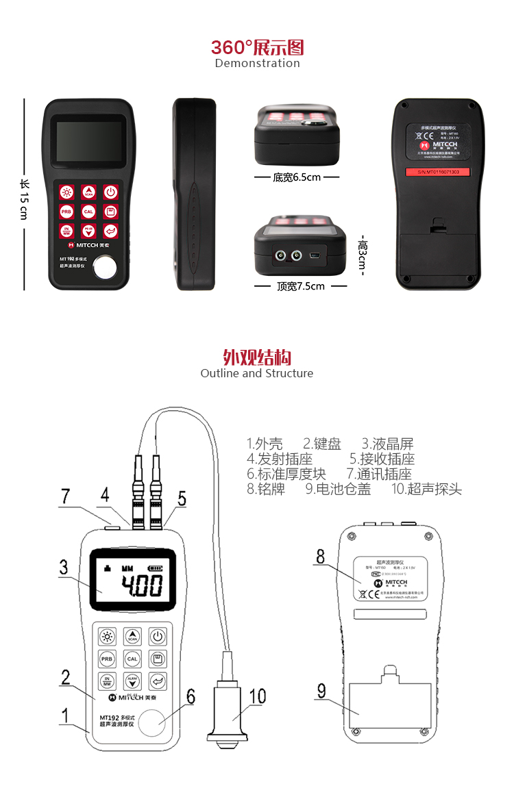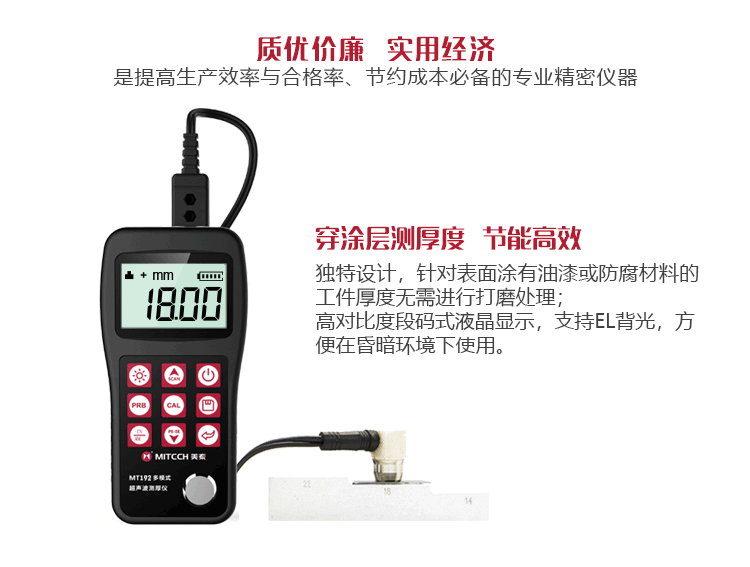 適合測量金屬(如鋼、鑄鐵、鋁、銅等)、塑料、陶瓷、玻璃、玻璃纖維及其他任何超聲波的良導體的厚度具有兩種測厚模式:發射-回波模式和回波-回波模式,可以穿透涂層進行厚度測量而不計入涂層厚度