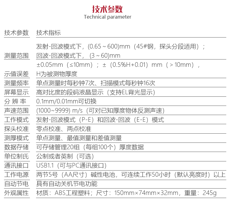 可存儲20組(每組最多100個測量值)厚度測量數據;通訊接口USB1.1
