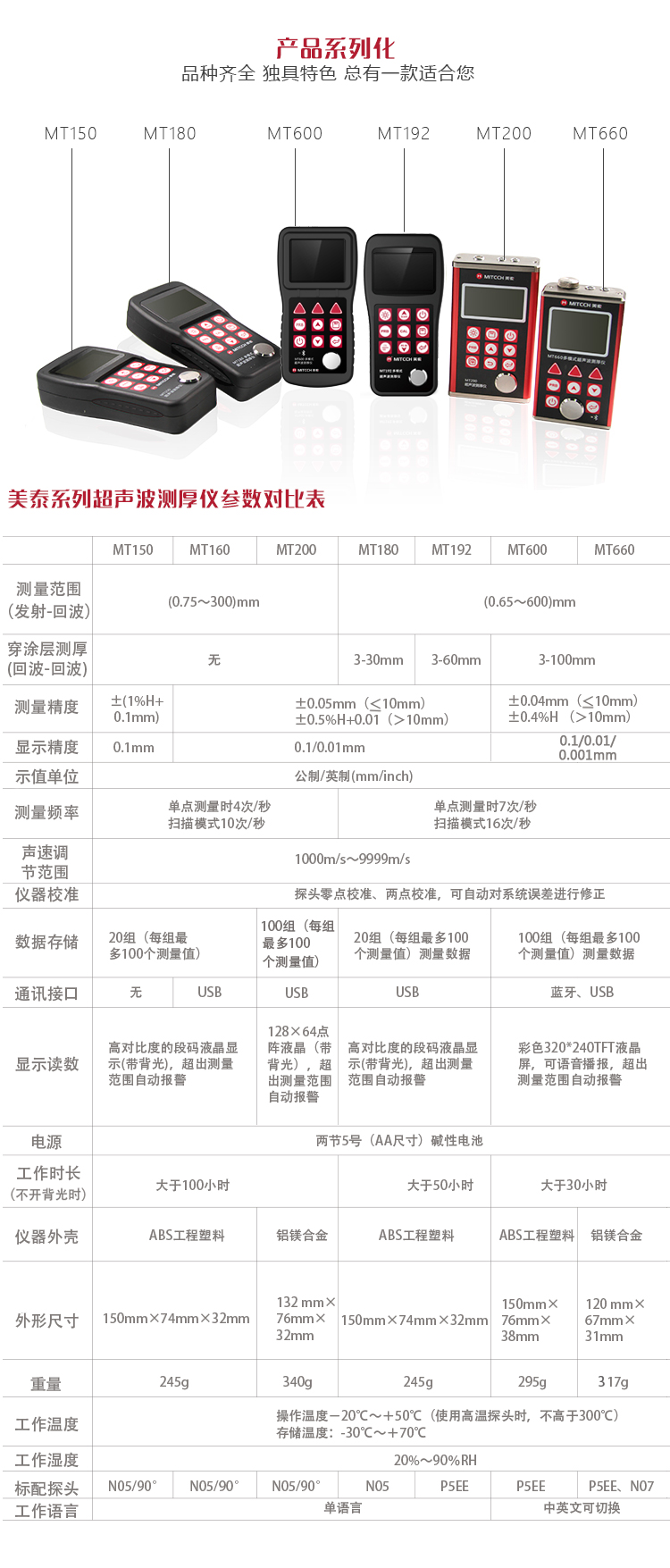 美泰系列超聲波測厚儀,均采用低功耗設計理念,超長待機,MT150/MT160/MT200/MT180/MT192/MT280/MT600/MT660均由兩節AA五號電池供電、更換方便。