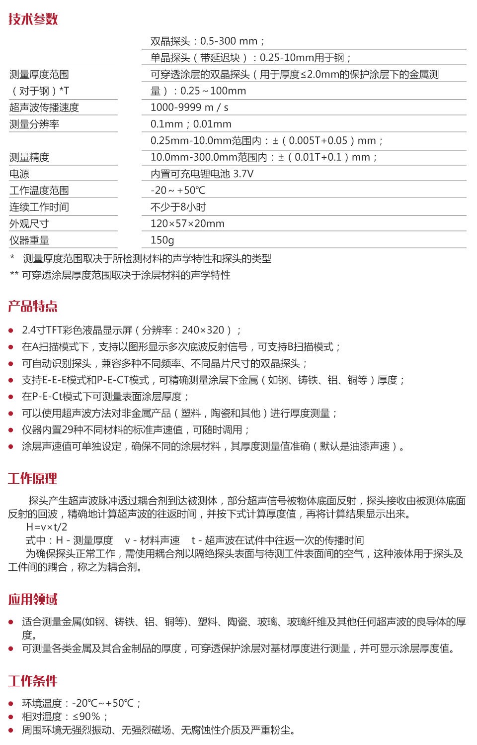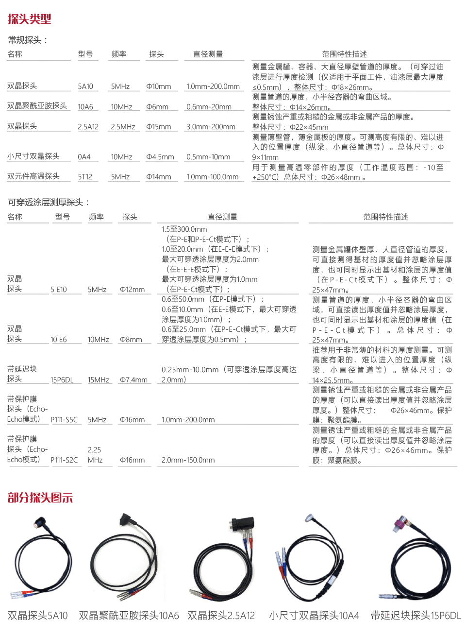 | 測量厚度范圍(對于鋼)*T | 雙晶探頭:0.5-300 mm;單晶探頭(帶延遲塊):0.25-10mm用于鋼;可穿透涂層的雙晶探頭(用于厚度≤2.0mm的保護涂層下的金屬測量):0.25~100mm |