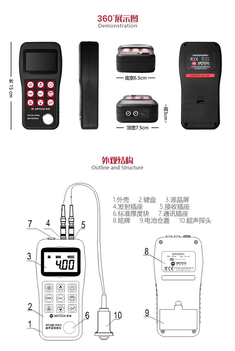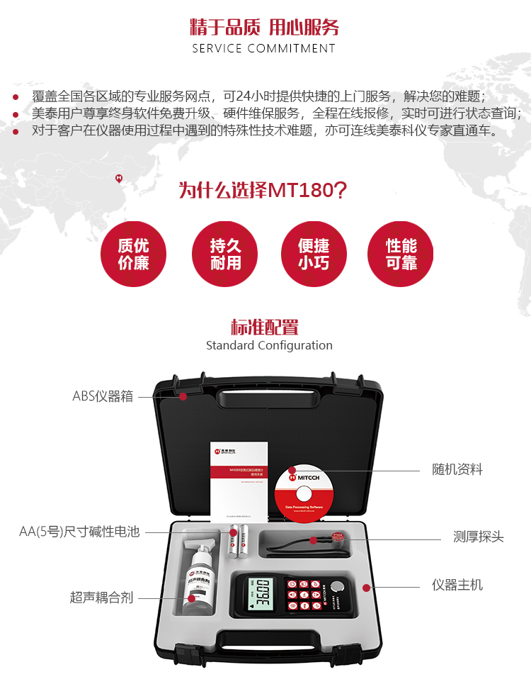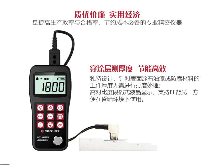 產品概述美泰MT180 超聲波測厚儀,基于超聲波測量原理,可對金屬、塑料、陶瓷、玻璃及其他多種超聲波的良導體材料進行厚度測量,也可實現對材料聲速的反測。與傳統的測量方法相比,超聲波測厚儀的優勢在于它只要接觸到被測工件的一面即可完成測量,其獨特的可穿透涂層測厚度的性能為表面涂有油漆或防腐材料的工件厚度檢測提供了更加高效的解決方案,測量前無需處理掉表面的涂層,直接亦可測量。被廣泛應用于石油、化工、冶金、造船、航空、航天等領域的生產設備中各種管道及壓力容器腐蝕減薄程度的監測,也可用于對各種板材及各種加工零件做精確的測量。是提高生產效率與合格率、節約成本必備的專業精密儀器。