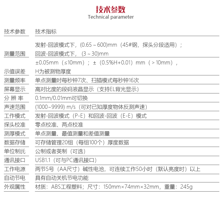| 反測聲速 | 支持,可對已知厚度物體反測聲速 |