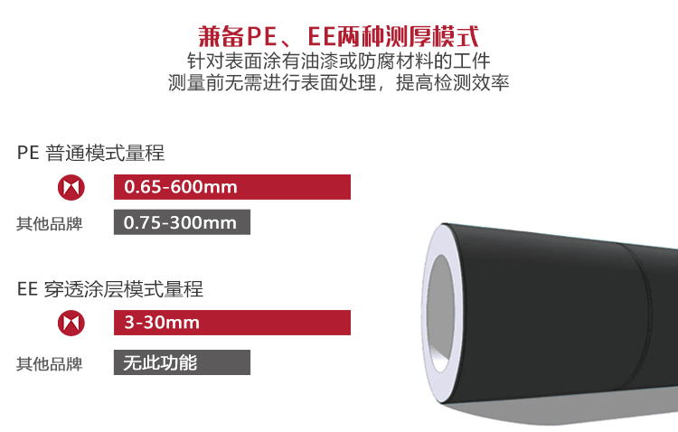 具有兩種測(cè)厚模式:發(fā)射-回波模式和回波-回波模式,可以穿透涂層進(jìn)行厚度測(cè)量而不計(jì)入涂層厚度