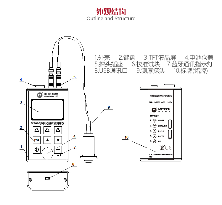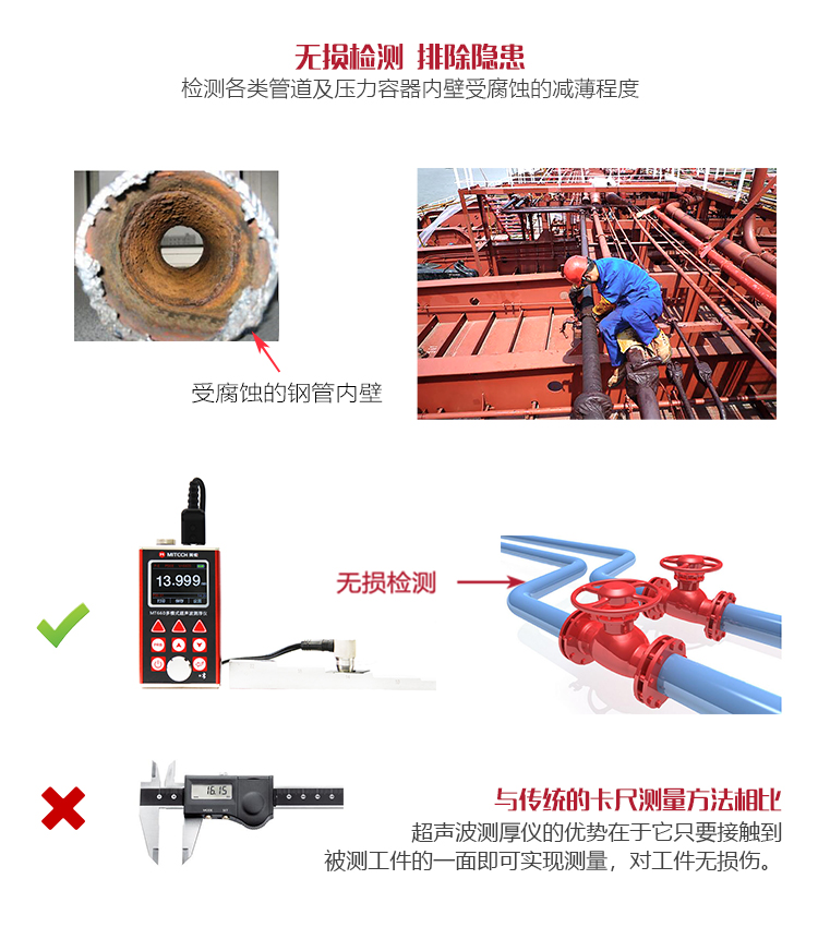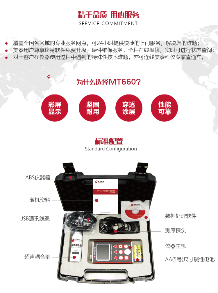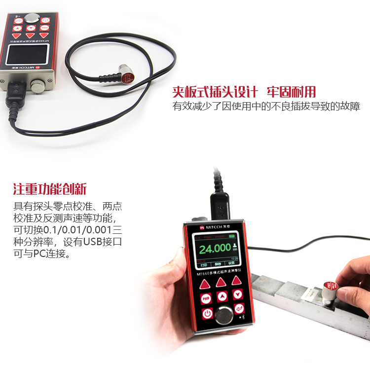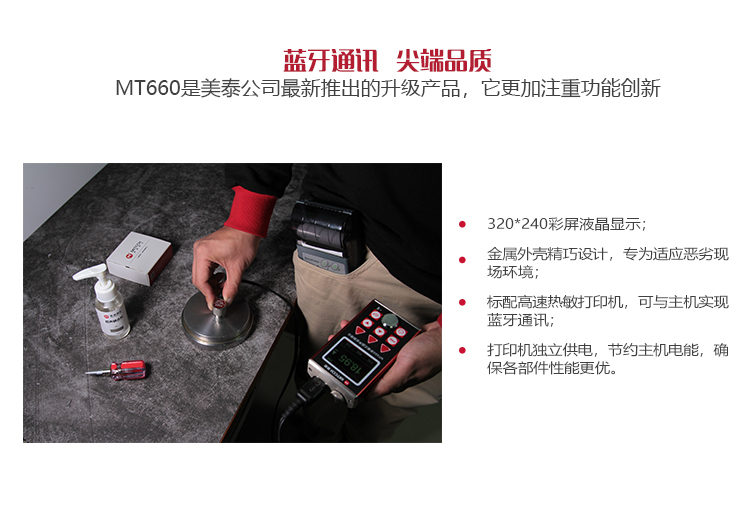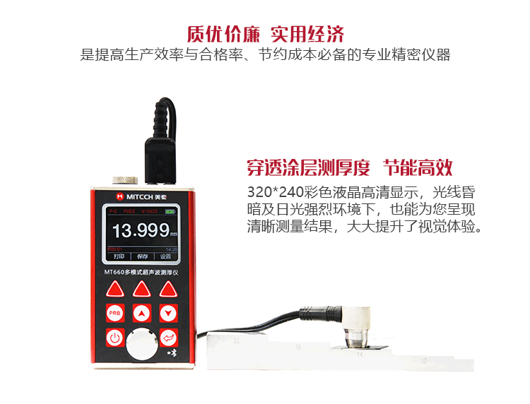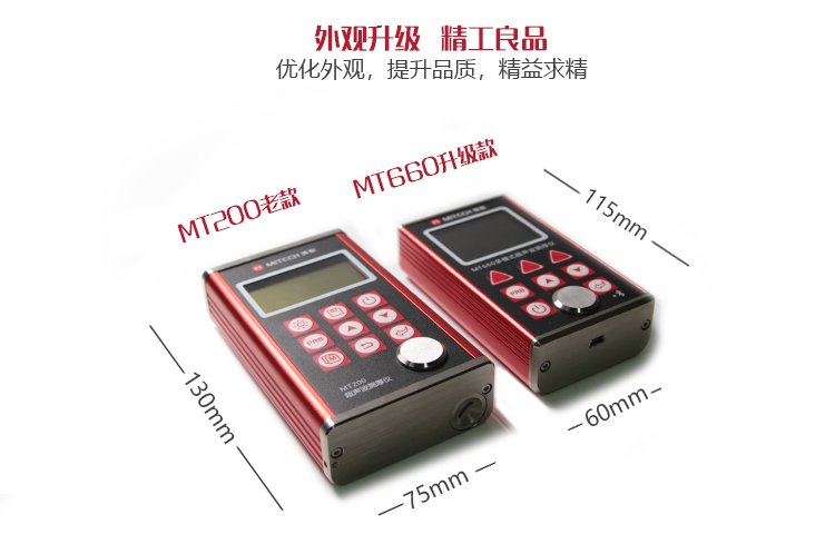 產(chǎn)品概述MT660超聲波測(cè)厚儀是美泰公司最新推出的升級(jí)產(chǎn)品,它更加注重用戶(hù)體驗(yàn)及功能創(chuàng)新,采用320×240彩色液晶顯示屏,光線昏暗及日光強(qiáng)烈環(huán)境下也能為您呈現(xiàn)清晰測(cè)量結(jié)果,大大提升了視覺(jué)體驗(yàn),密封的鋁美合金外殼精巧設(shè)計(jì),體積更小、品質(zhì)更優(yōu),專(zhuān)為防御惡劣現(xiàn)場(chǎng)環(huán)境中的油污、粉塵而設(shè)計(jì);智能化警示功能,超出設(shè)定范圍可自動(dòng)提示,可方便讀數(shù),滿(mǎn)足高效采集材料多點(diǎn)厚度的精準(zhǔn)檢測(cè)需求,支持0.001高精度顯示、藍(lán)牙通訊,兼?zhèn)浯┩竿繉幽J脚c普通模式雙效功能,其獨(dú)特的可穿透涂層測(cè)厚度的性能為表面涂有油漆或防腐材料的工件厚度檢測(cè)提供了更加高效的解決方案,測(cè)量前無(wú)需處理掉表面的涂層,直接亦可測(cè)量。被廣泛應(yīng)用于石油、化工、冶金、造船、航空、航天等領(lǐng)域的生產(chǎn)設(shè)備中各種管道及壓力容器腐蝕減薄程度的監(jiān)測(cè),也可用于對(duì)各種板材及各種加工零件做精確的測(cè)量。是提高生產(chǎn)效率與合格率、節(jié)約成本必備的專(zhuān)業(yè)精密儀器。
