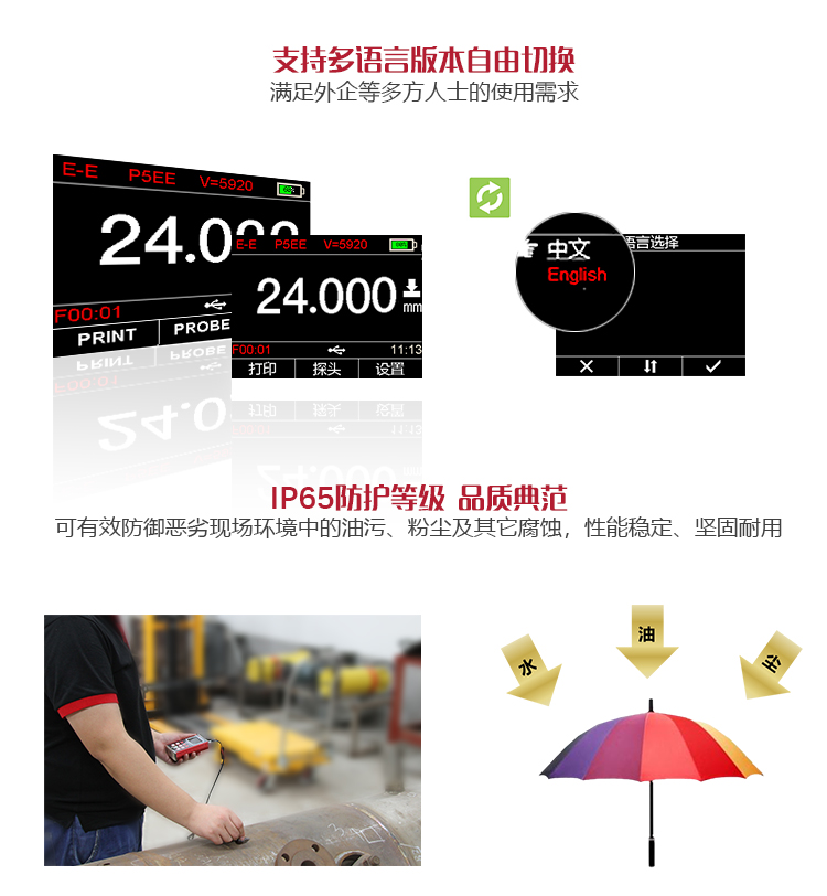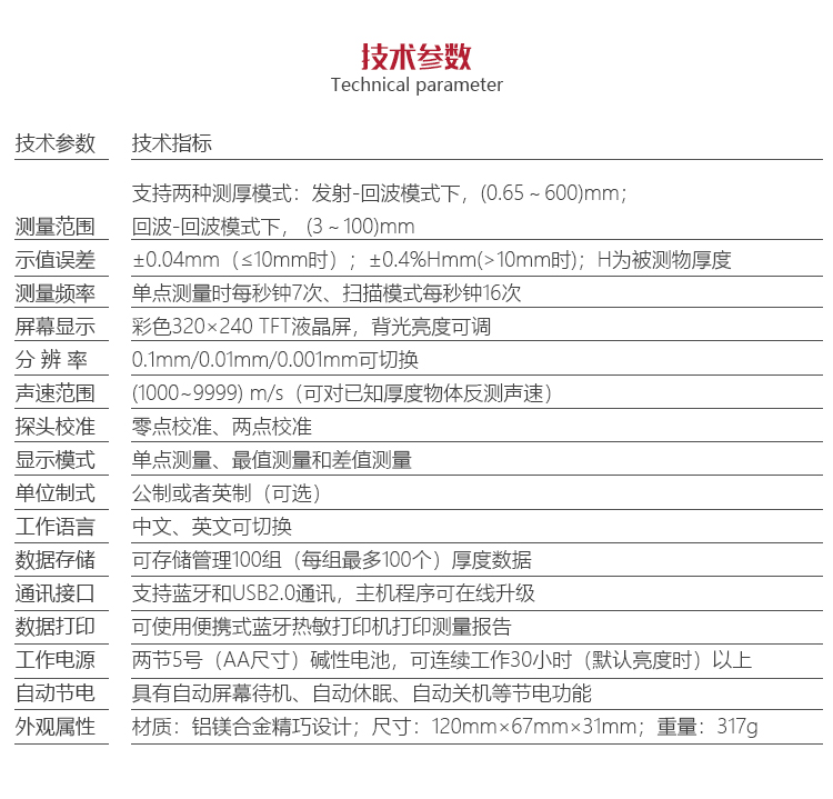 | 存儲(chǔ) | 可存儲(chǔ)管理100組(每組最多100個(gè))厚度數(shù)據(jù) |