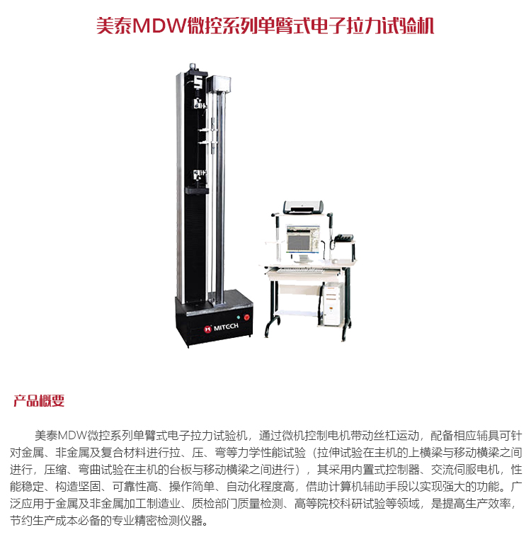 產品概述美泰MDW微控系列單臂式電子拉力試驗機,通過微機控制電機帶動絲杠運動,配備相應輔具可針對金屬、非金屬及復合材料進行拉、壓、彎等力學性能試驗(拉伸試驗在主機的上橫梁與移動橫梁之間進行,壓縮、彎曲試驗在主機的臺板與移動橫梁之間進行),其采用內置式控制器、交流伺服電機,性能穩定、構造堅固、可靠性高、操作簡單、自動化程度高,借助計算機輔助手段以實現強大的功能。廣泛應用于金屬及非金屬加工制造業、質檢部門質量檢測、高等院校科研試驗等領域,是提高生產效率,節約生產成本必備的專業精密檢測儀器。