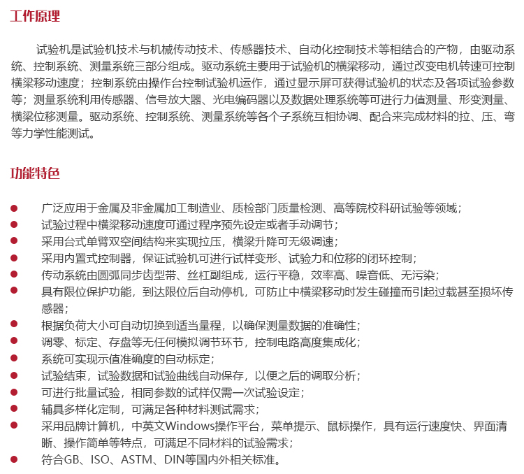 工作原理試驗機是試驗機技術與機械傳動技術、傳感器技術、自動化控制技術等相結合的產物,由驅動系統、控制系統、測量系統三部分組成。驅動系統主要用于試驗機的橫梁移動,通過改變電機轉速可控制橫梁移動速度;控制系統由操作臺控制試驗機運作,通過顯示屏可獲得試驗機的狀態及各項試驗參數等;測量系統利用傳感器、信號放大器、光電編碼器以及數據處理系統等可進行力值測量、形變測量、橫梁位移測量。驅動系統、控制系統、測量系統等各個子系統互相協調、配合來完成材料的拉、壓、彎等力學性能測試。