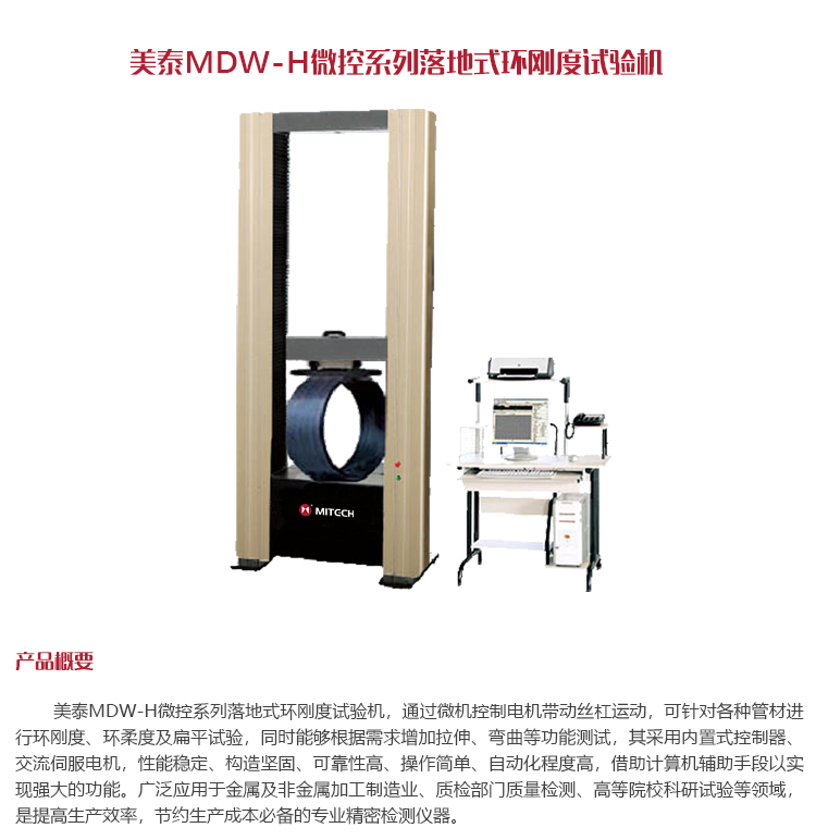產(chǎn)品概述美泰MDW-H微控系列落地式環(huán)剛度試驗機,通過微機控制電機帶動絲杠運動,可針對各種管材進行環(huán)剛度、環(huán)柔度及扁平試驗,同時能夠根據(jù)需求增加拉伸、彎曲等功能測試,其采用內(nèi)置式控制器、交流伺服電機,性能穩(wěn)定、構造堅固、可靠性高、操作簡單、自動化程度高,借助計算機輔助手段以實現(xiàn)強大的功能。廣泛應用于金屬及非金屬加工制造業(yè)、質(zhì)檢部門質(zhì)量檢測、高等院校科研試驗等領域,是提高生產(chǎn)效率,節(jié)約生產(chǎn)成本必備的專業(yè)精密檢測儀器。