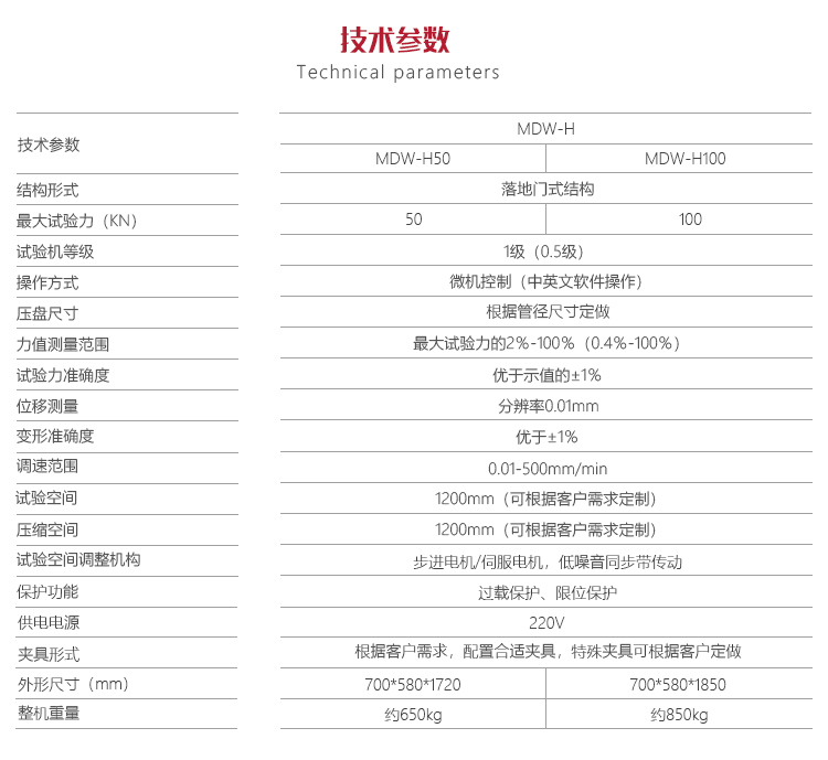采用臺式單臂雙空間結構來實現(xiàn)拉壓,橫梁升降可無級調(diào)速;