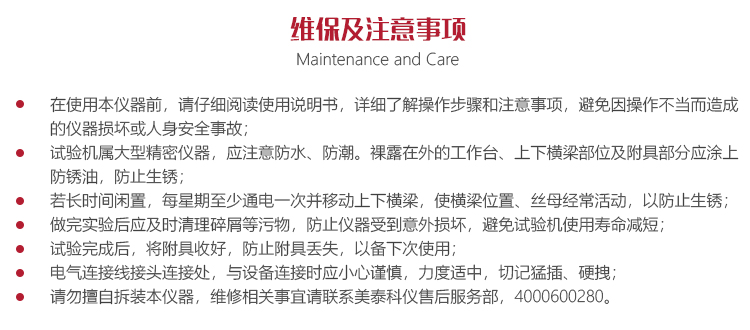 試驗機屬大型精密儀器,應注意防水、防潮。裸露在外的工作臺、上下橫梁部位及附具部分應涂上防銹油,防止生銹;