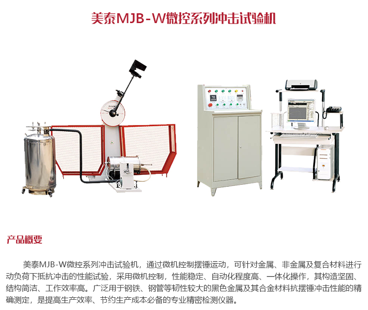 產品概述美泰MJB-W微控系列沖擊試驗機,通過微機控制擺錘運動,可針對金屬、非金屬及復合材料進行動負荷下抵抗沖擊的性能試驗,采用微機控制,性能穩定、自動化程度高、一體化操作,其構造堅固、結構簡潔、工作效率高。廣泛用于鋼鐵、鋼管等韌性較大的黑色金屬及其合金材料抗擺錘沖擊性能的精確測定,是提高生產效率、節約生產成本必備的專業精密檢測儀器。
