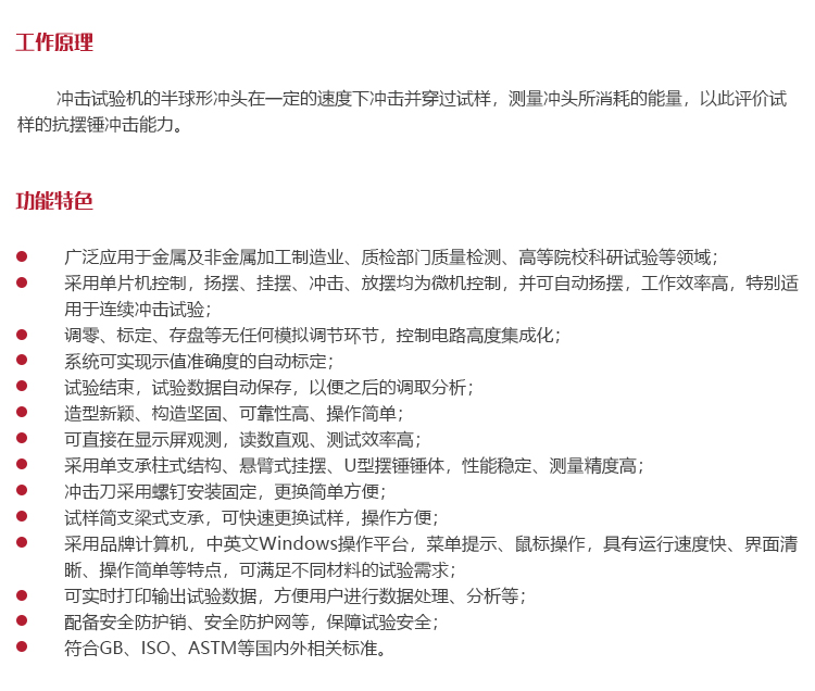 采用單片機控制,揚擺、掛擺、沖擊、放擺均為微機控制,并可自動揚擺,工作效率高,特別適用于連續沖擊試驗;