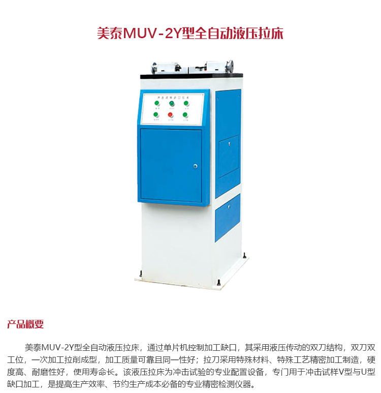 美泰MUV-2Y型全自動液壓拉床,通過單片機控制加工缺口,其采用液壓傳動的雙刀結構,雙刀雙工位,一次加工拉削成型,加工質量可靠且同一性好;拉刀采用特殊材料、特殊工藝精密加工制造,硬度高、耐磨性好,使用壽命長。該液壓拉床為沖擊試驗的專業配置設備,專門用于沖擊試樣V型與U型缺口加工,是提高生產效率、節約生產成本必備的專業精密檢測儀器。