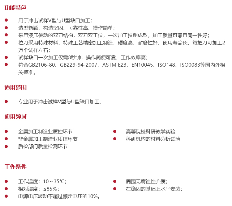試樣缺口一次加工僅需8秒鐘,操作簡便可靠,工作效率高;